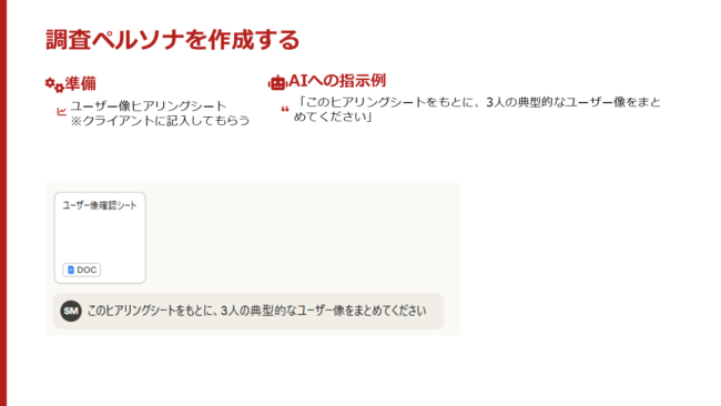 ヒアリングシートがないときはAIに「うちの得意先のユーザー像を営業さんにヒアリングしたいので、ヒアリングシートを作ってください」。みたいな指示をすればさっと作ってくれます。ヒアリングシートを渡しても書いてくれないときもあるので、その場合は自分から赴いて聞いてみましょう。