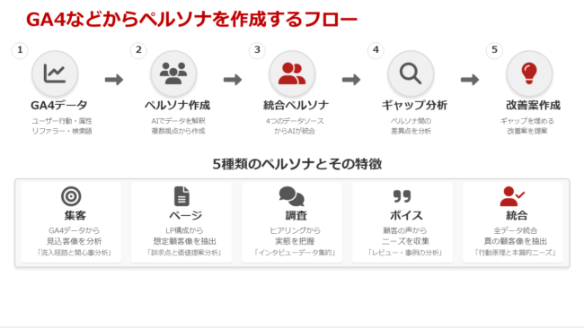最終的な目的である集客とページの改善をしたいので、統合ペルソナとのギャップを見ます。