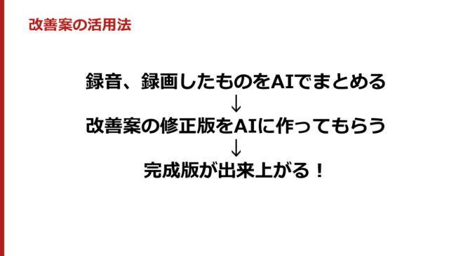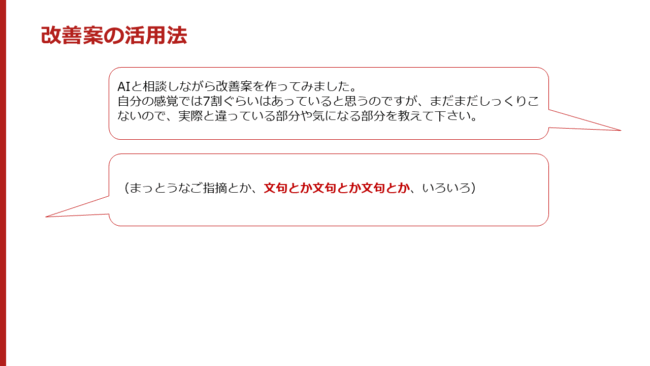 皆さんがAIの改善案が使えないといっているのは、AIが出したものを答えだと思っているからです。