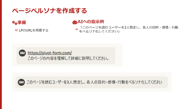 ここで使うペルソナは顧客像を明確にするためではなく、あくまでAIが判断しやすくするのと、人間たちの判断を揃えるための基準です。ペルソナというよりも想定ユーザーと考えるといいのかもしれませんね。