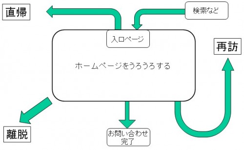 どこからか訪問者が来て直帰するか離脱するか何か買うかもう一回来るか、ということですね。ですので、ホームページ運営でやることはこれらの数値を増減させていくことだけです。デザインを変えることで離脱率を減らす、とかですね。デザインを変えるのは見栄えを良くすることもありますが、それ以外にもきちんとした数値管理をすると軌道修正がしやすいです。
