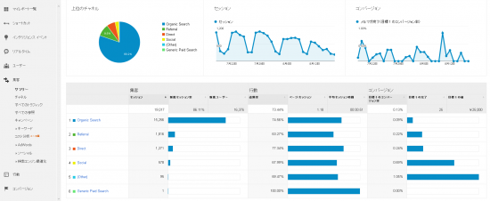 上図の場合は、Organic Searchは新規の訪問者を集めやすいですが直帰率も高くコンバージョン率も低い。Socialはリピート率が高く(新規セッション率が低い)コンバージョン率も高いので、Organic Searchで集めた新規ユーザーをSocialでリピートさせれば良いということが分かります。ここまでわかればサイト上にSNSへのリンクボタンを見やすい位置に設置すれば良いとなりますよね。Twitterのボタンって必要なの?って思う時があれば集客→サマリーを見て判断してみてください。