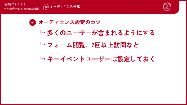 - オーディエンスを設定してからデータがたまるまでに少し時間がかかるので、なるべく早めに設定しておきましょう。